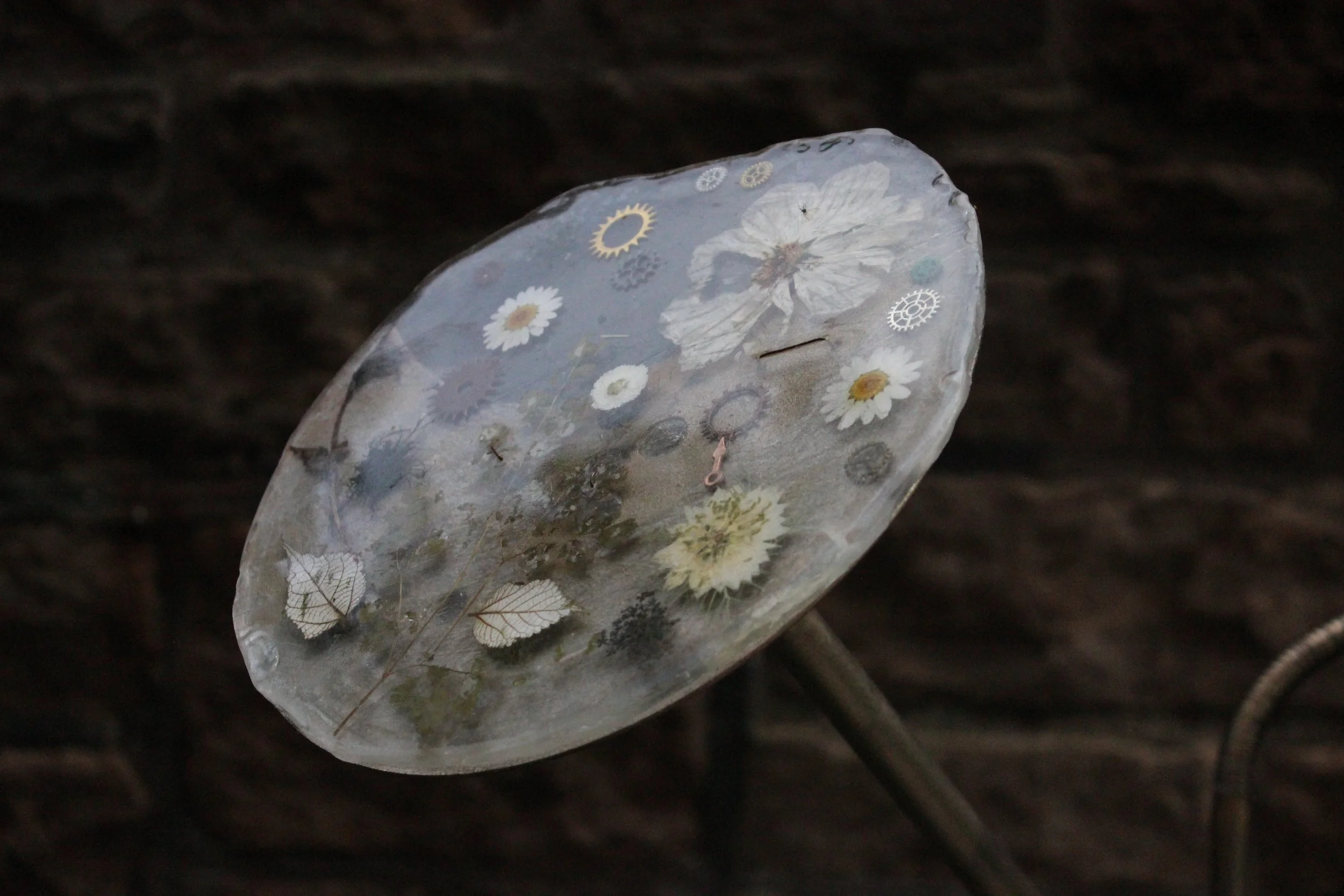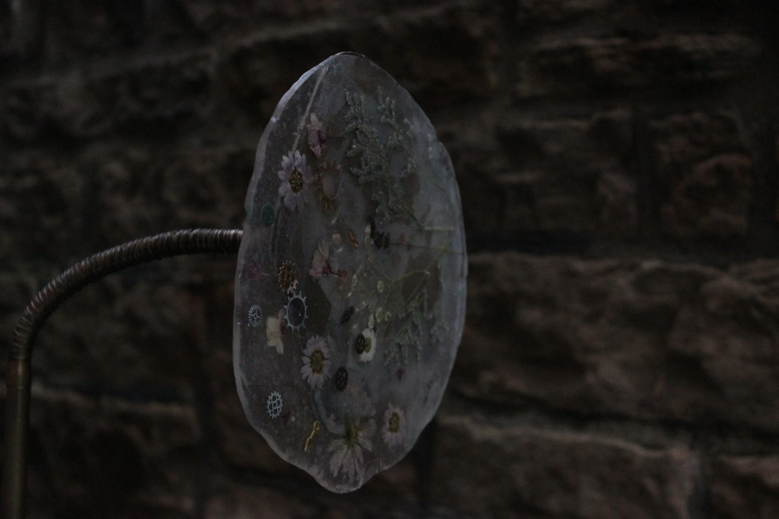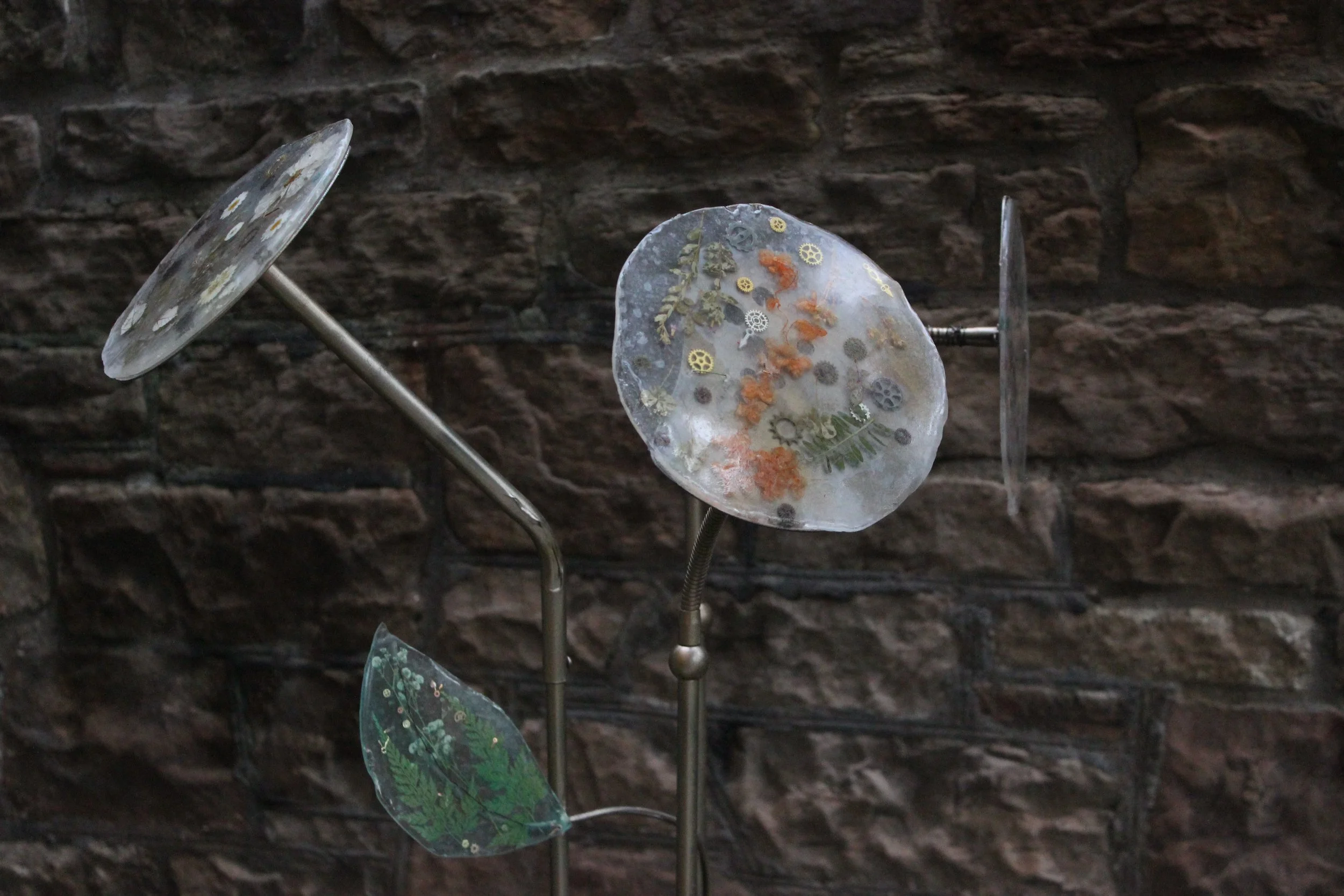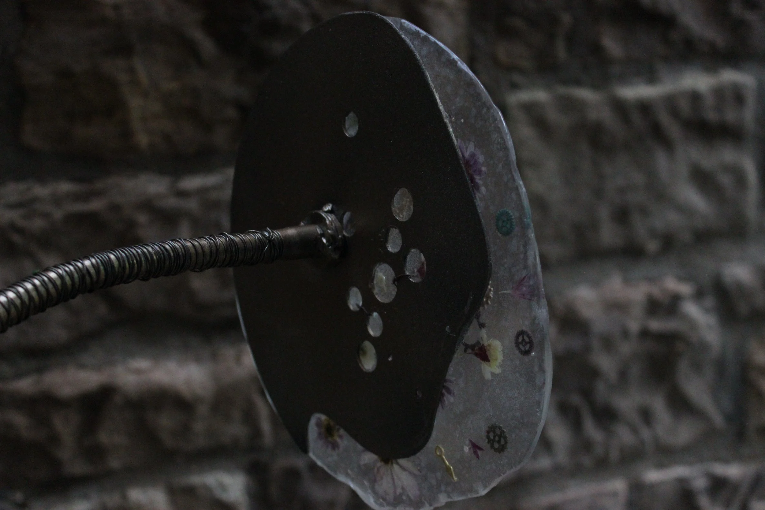 Medium: found and recycled standing lamps, reclaimed metal, non-toxic resin, dried plants collected over time from the client’s garden, and components from old mechanical watches.