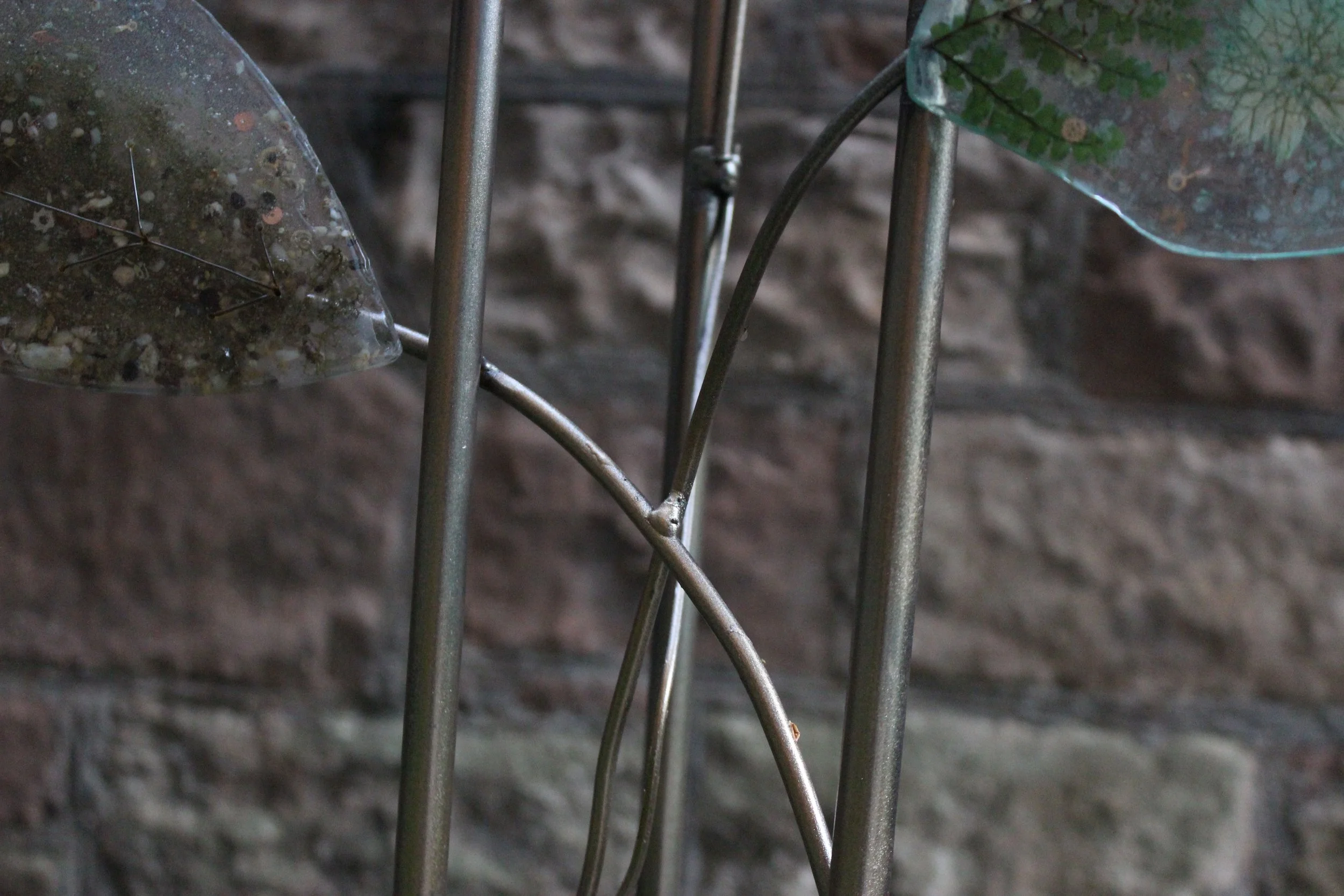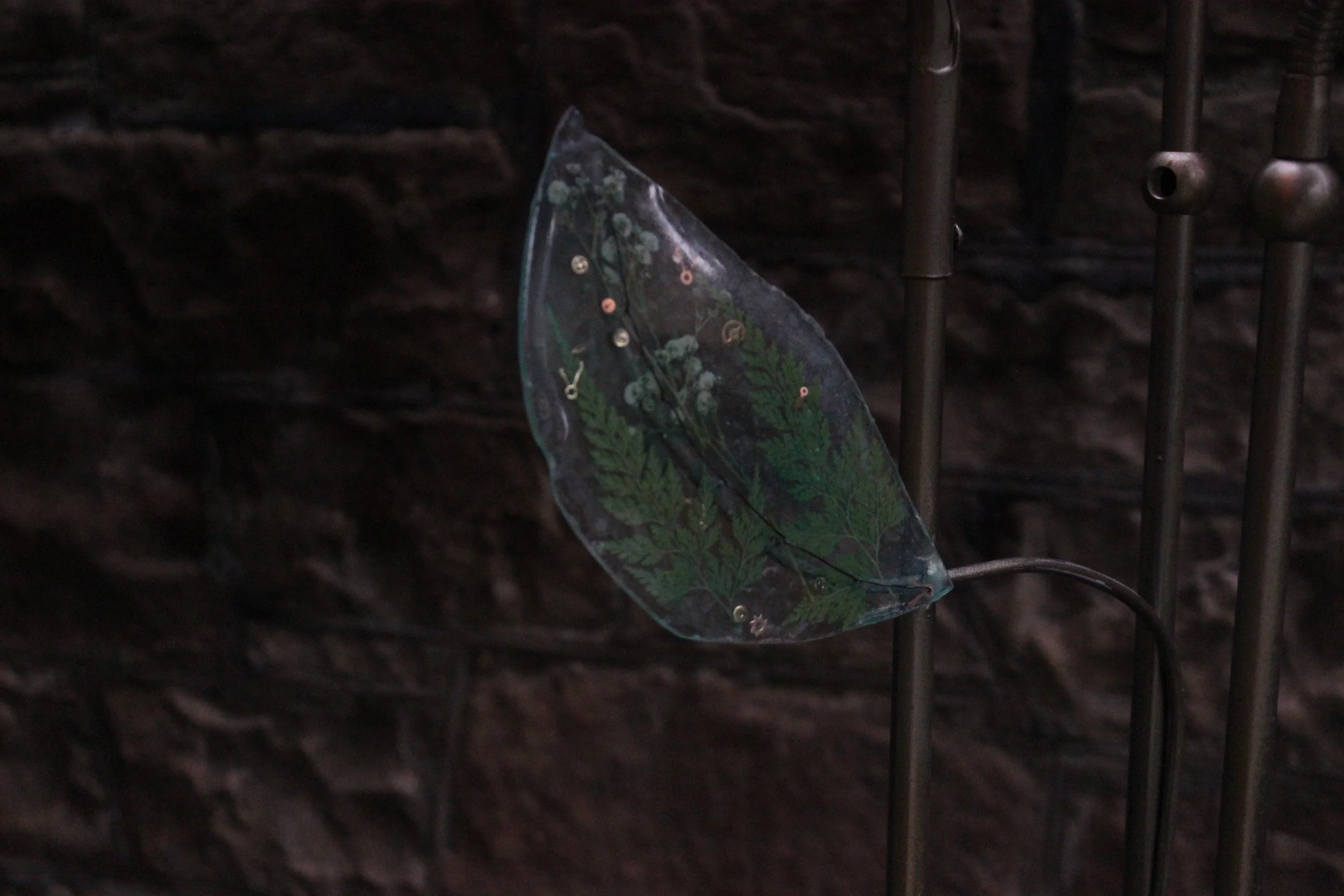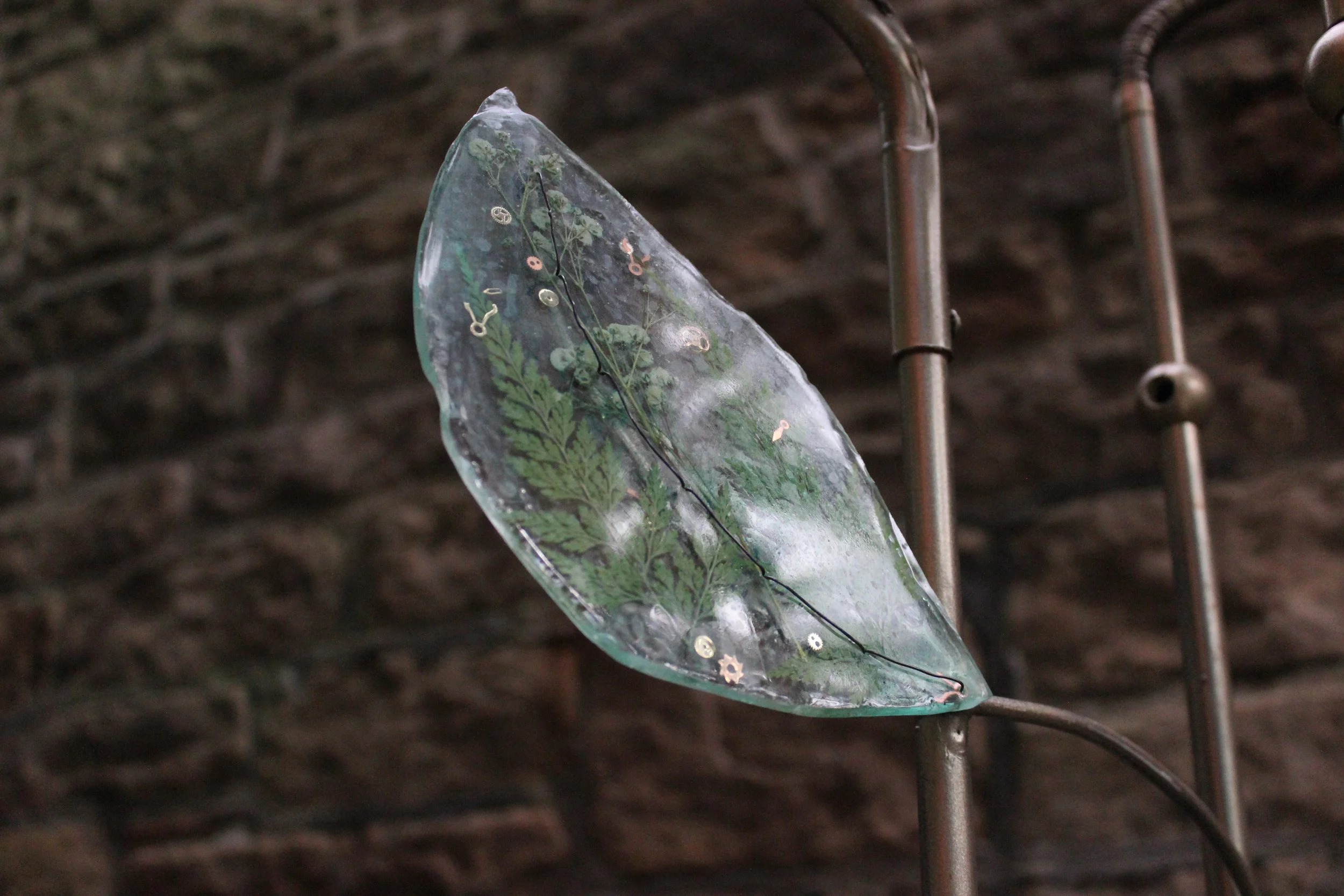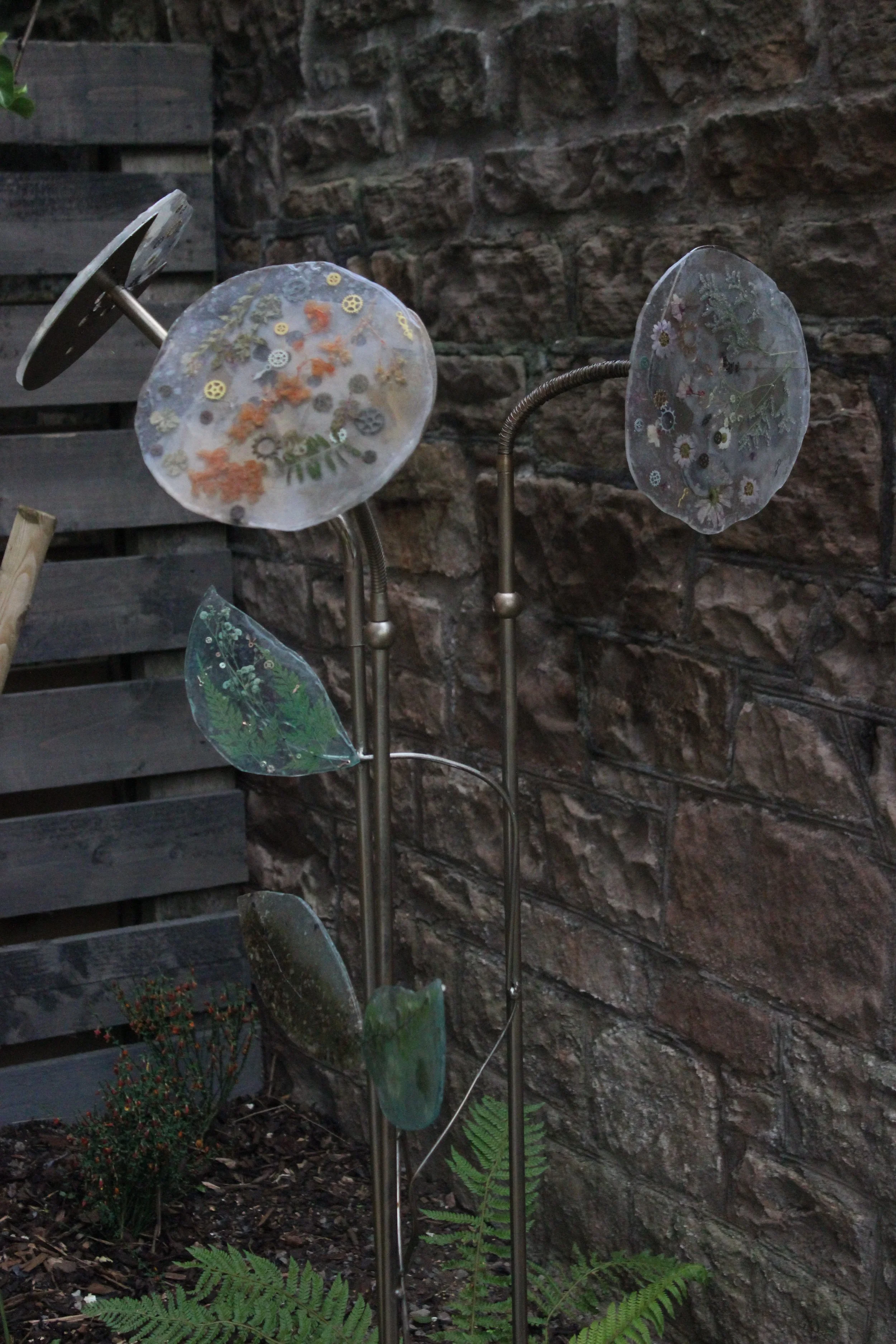 Medium: found and recycled standing lamps, reclaimed metal, non-toxic resin, dried plants collected over time from the client’s garden, and components from old mechanical watches.