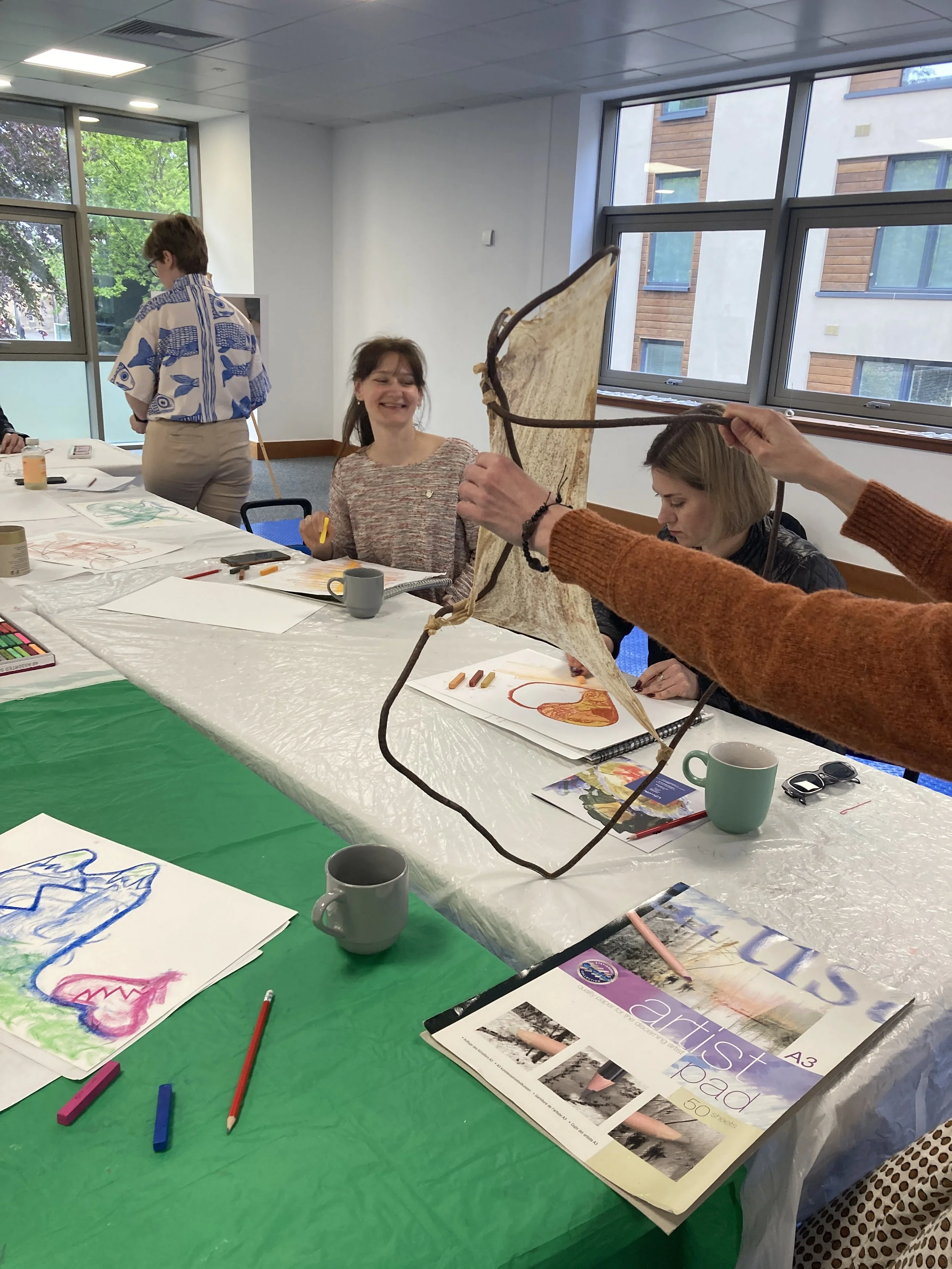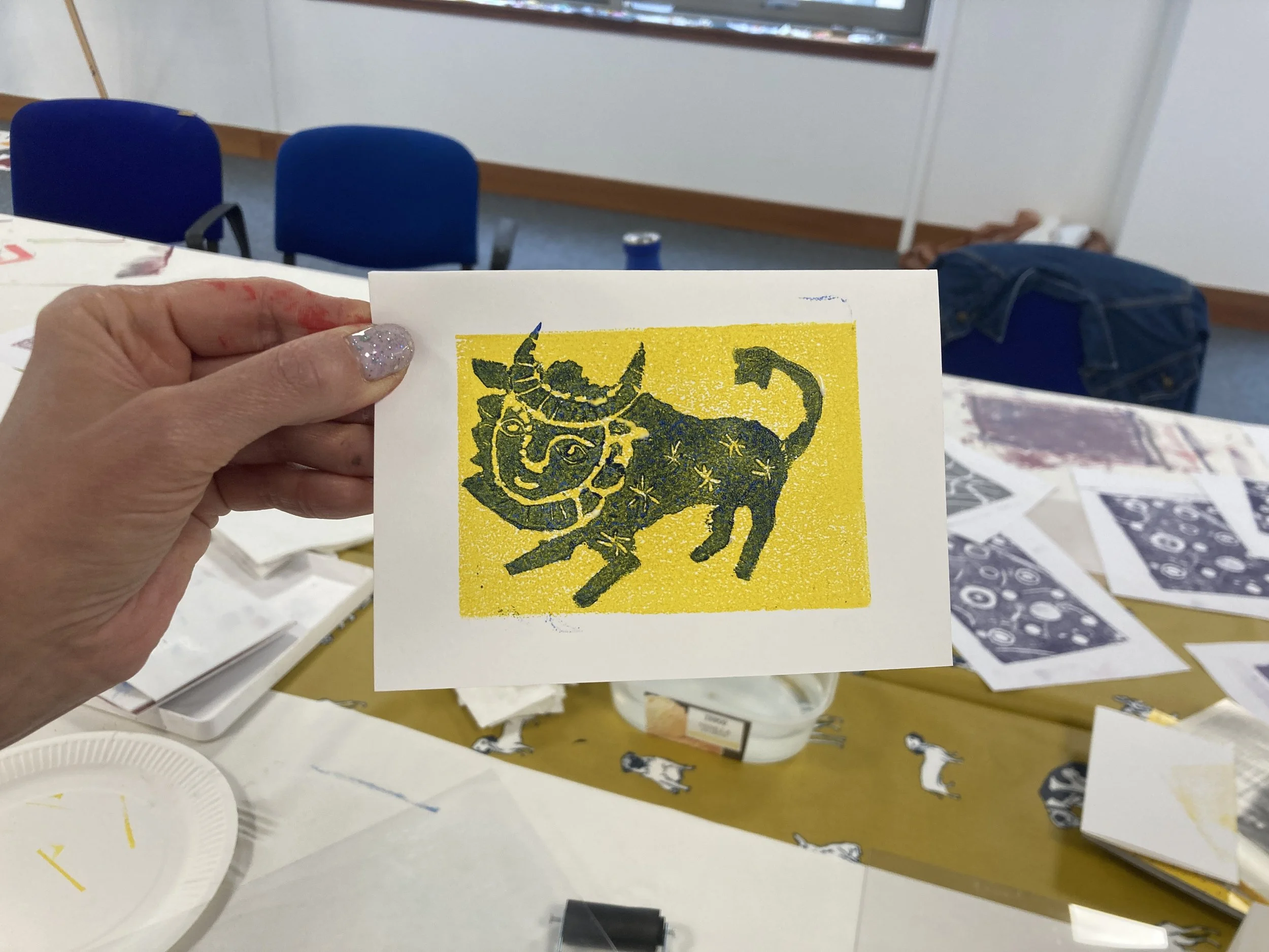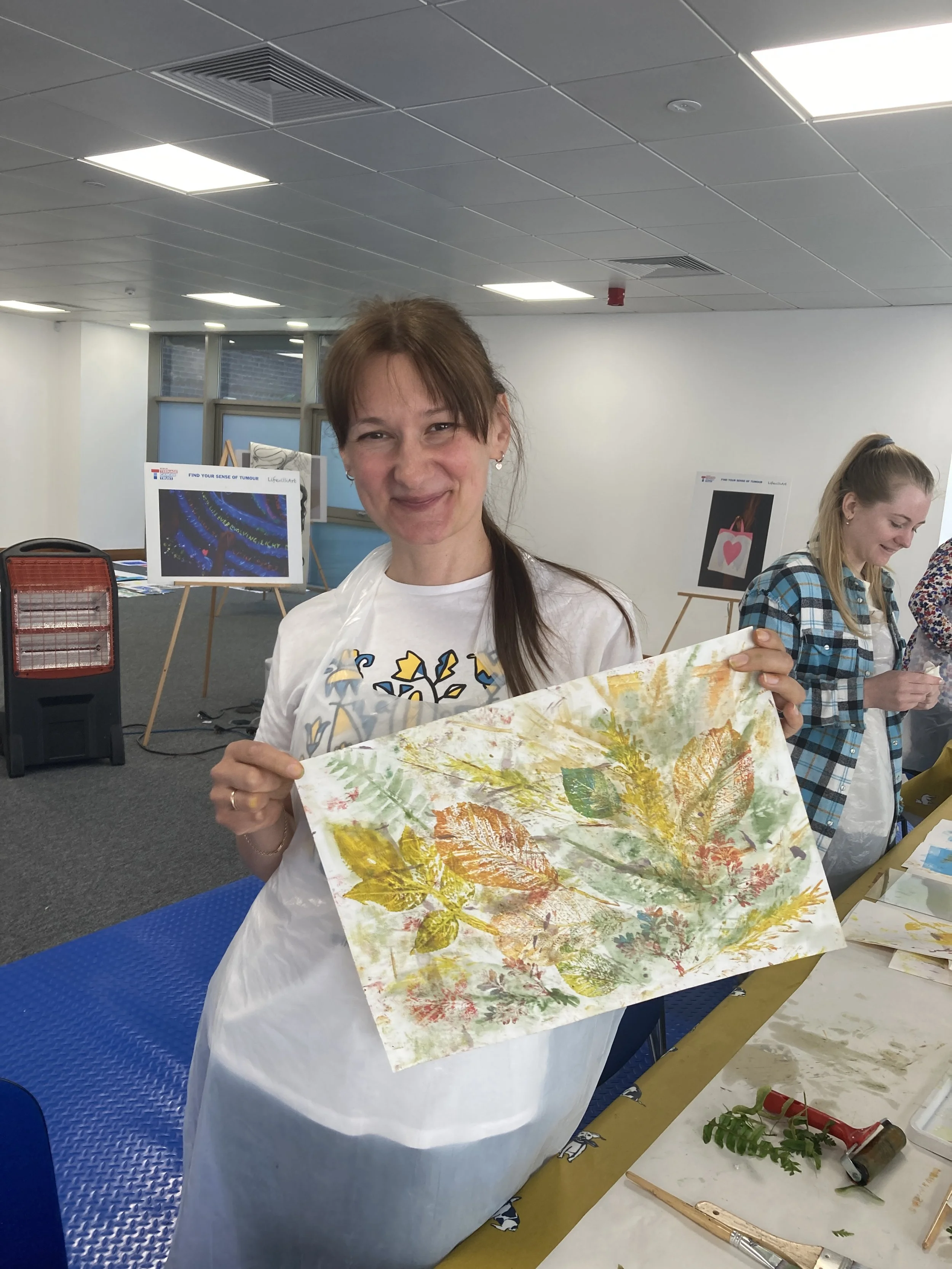 Every Friday since May 2023 the doors are open for the existing art and wellbeing group as well as for new joiners from displaced communities. The plans are to introduce participants to the basics of printmaking, and mixed media allowing both individual and collective creative expression. Co-created artwork was previously showcased for the group show Creative Forces on 6th October 2023 at Dean House, Edinburgh.